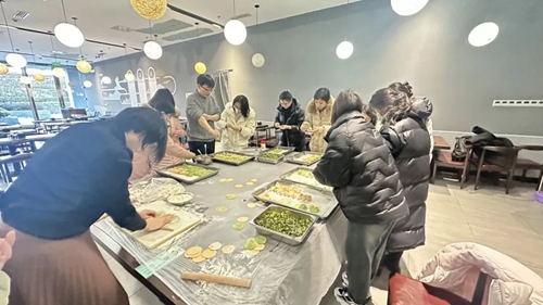 亞歲將至蒼穹美,喜迎新晝皆歡“寓”,冬至之日,嵩山美寓聯合中信銀行,組織廣大美寓青年共同在共享空間開展包餃子主題活動。暮色將至,嵩山美寓一層大廳燈火輝煌、門庭若市,在大廳共享廚房,面粉、廚具原材料鋪展開來。美寓青年陸續來到共享空間,挽起袖子、摩拳擦掌。大家相互配合,和面、加水、搟面皮,不一會的功夫,一個個形狀奇巧餃子皮“橫空出世”。