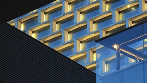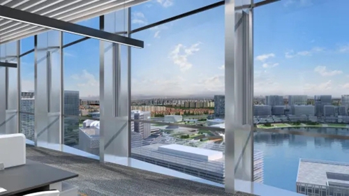 城發中心以“嵩山書頁巖”為設計理念,以中空LOW-E玻璃打造極簡幕墻立面,玻璃寬約3米,隱藏式開啟窗。