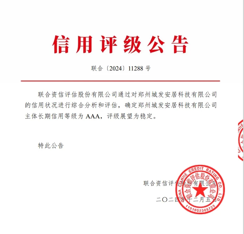 12月5日,鄭州城市發展集團有限公司下屬子公司鄭州城發安居科技有限公司(以下簡稱安居科技)順利取得AAA主體信用評級,評級展望為“穩定”,成功邁入國內企業信用等級第一梯隊。