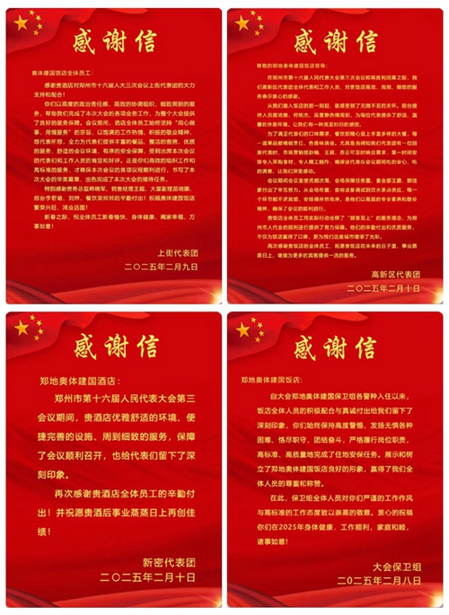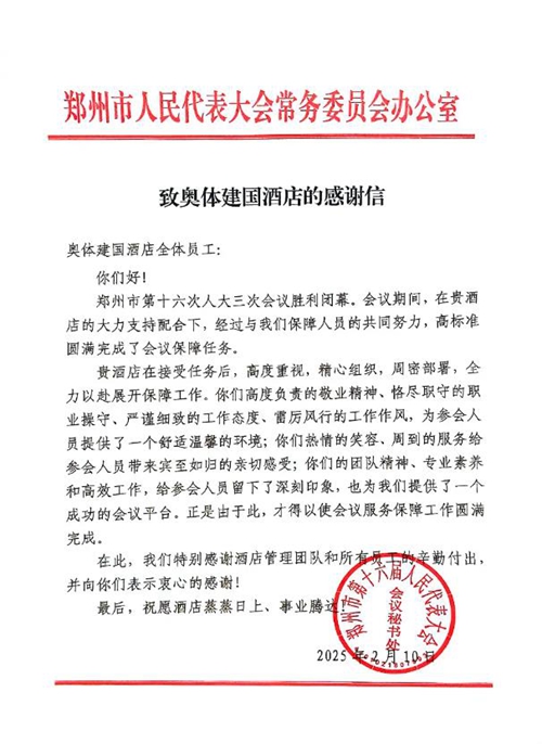 2025年2月10日,鄭州市第十六屆人民代表大會(huì)第三次會(huì)議第二次全體會(huì)議勝利閉幕。鄭州城市發(fā)展集團(tuán)旗下河南鄭地奧體建國飯店作為本次大會(huì)的駐地保障酒店,以“五星”服務(wù)標(biāo)準(zhǔn)(環(huán)境舒心、食宿貼心、細(xì)節(jié)暖心、保障安心、文化潤心),圓滿完成了各項(xiàng)接待任務(wù),贏得了與會(huì)代表和會(huì)務(wù)組的一致好評(píng)。