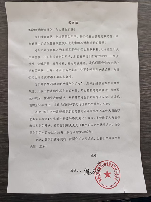 守護(hù)賈魯河的生態(tài)之美,是綠化養(yǎng)護(hù)人矢志不渝的責(zé)任與光榮使命。每一片蔥郁的樹林、每一處綻放的花海、每一聲清脆的鳥鳴,都見證著養(yǎng)護(hù)團(tuán)隊(duì)的匠心與堅(jiān)守。此次收到鄭東新區(qū)崗李村村委的錦旗和感謝信,令全體團(tuán)隊(duì)倍感鼓舞。這不僅是對養(yǎng)護(hù)團(tuán)隊(duì)專業(yè)能力的認(rèn)可,更是對賈魯河生態(tài)治理成效的高度肯定。