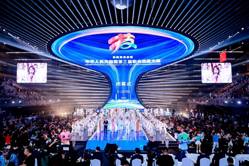 華燈璀璨,掌聲如潮。9月23日晚,當348名獲獎選手高舉隊旗與獎章,當大賽會旗在璀璨的舞臺上完成交接傳遞,當良渚文化和人形機器人在現場8000余名觀眾的歡呼聲中共舞……中華人民共和國第三屆職業技能大賽閉幕式在鄭州奧體中心體育館完美落幕!