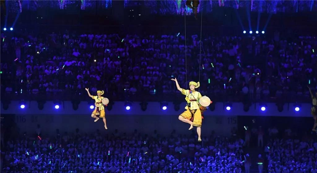 5塊總面積,超過3000平米的輕型透明網幕,130余臺高清投影機覆蓋上萬平米場地,通過威亞的技術手段和地面投影相呼應。地面、空中、立面多維度的表演空間,將各種特色民族元素呈現出來,呈現了各族人民的幸福生活,書寫出一張張民族文化名片。當現場各族人民跳起歡快的舞蹈,當各民族美麗的服飾在現場轉出最絢麗的弧度,展現出各民族團結奮進、朝氣蓬勃的精神風貌。作為河南特色的少林和太極兩個重要元素也在本次開幕式精彩亮相,由塔溝武校數千名演員演繹。隨著音樂節奏的轉換,他們變幻各種造型,動靜結合、氣勢恢宏,讓觀眾更加了解精彩河南。