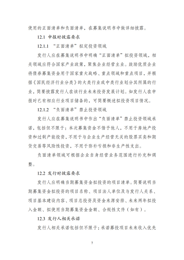 (一)申報材料應明確債券募集資金擬投資領域,形成“正面清單”。“正面清單”應符合國家產業政策,聚焦企業經營主業。支持優質企業在“正面清單”擬定的范圍內依法合規安排使用募集資金,提高債券資金使用效率和靈活度。
